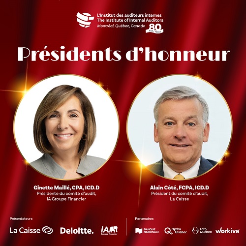 Nous sommes ravis d'annoncer la participation de Mme Ginette Maillé, Présidente du Comité d'Audit chez iA Groupe Financier, et M. Alain Côté, Président du comité d'audit de La Caisse, en tant que présidents d'honneur du Gala 80e Anniversaire de l'IAIM ! Leur parcours et engagement en font des figures inspirantes dans le domaine de l'audit interne, et leur présence à nos côtés donnent un éclat tout particulier à cet événement.